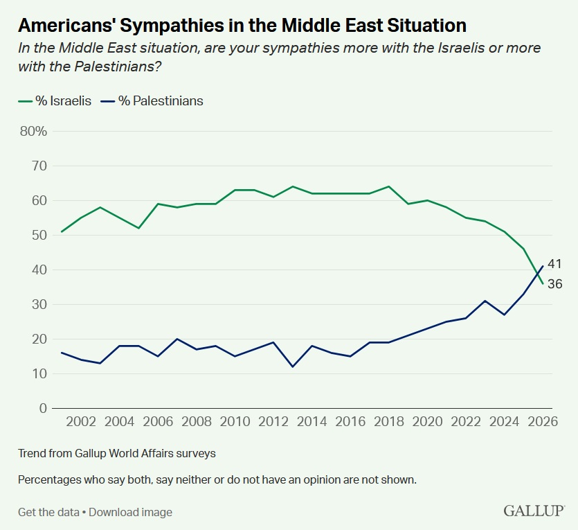 - February 2026: For the first time ever, A majority of Americans now support Palestinians over Israel, 41% to 36% – a reversal in only one year from 46% vs. 33% favoring Israel.